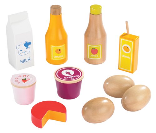 - Comprende: bottiglia di succo d'arancia, bottiglia di succo di mela, cartone di latte, succo d'arancia, yogurt, marmellata, formaggio e tre uova.