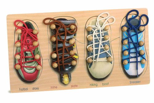 Il pannello di legno su cui ci sono quattro scarpe diverse l'ideale per insegnare ai bambini ad allacciarsi le scarpe.