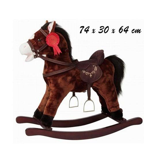 Cavallo a dondolo Cavallo a dondolo con base di legno e corpo in morbido peluche resistente. Il cavallo, schiacciando le orecchie, emette suoni (nitrito e galoppo) e muove la bocca. Consigliato a bambini dai 36mesi + Misure (Larghezza x Lunghezza x Altezza): 30x74x64 Altezza seduta: 46cm