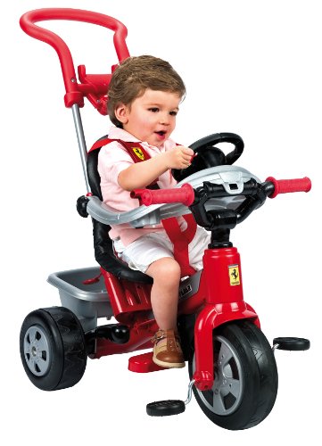 Il triciclo Ferrari di FEBER caratterizzato dai colori della famosa scuderia di formula 1. Questo triciclo permette ai bambini di fare i loro primi giri su tre ruote intutta sicurezza (telaio amovibile con blocco di direzione per impedire le cadute,imbracatura di sicurezza, canna di controllo per i genitori). Il triciclo Ferrari possiede anche un sedile molto confortevole con imbottiturein pelle.
