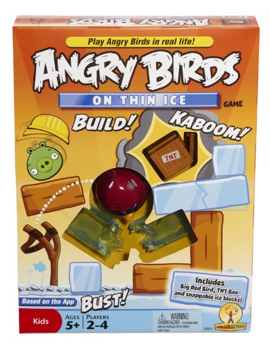 Angry Birds On Thin Ice is the second instalment of the exciting skill and action game based on the best-selling phone app, Angry Birds. It lets players build, launch and destroy with fun new features, including pigs with helmets, breakable ice block building pieces, an exploding TNT box and a new large red bird character. Players draw a card and build the structure shown before their opponents launch Angry Birds in an attempt to knock down the structure-and the pigs-to win points. Angry Birds On Thin Ice includes 2 Angry Birds, 3 green pigs, 1 slingshot-style catapult launcher, structure pieces and mission cards.