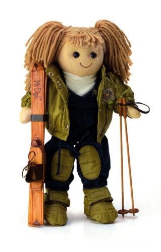 La bambola sciatrice corredata di sci e bastoncini. E' interamente spogliabile consentendo cos alla bambina di vestire con un abito diverso la sua bambola.