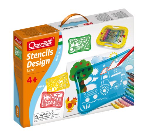 Quercetti 2645 - Stencil Design Farm Valigia con 4 Stencil con Matite e Modelli