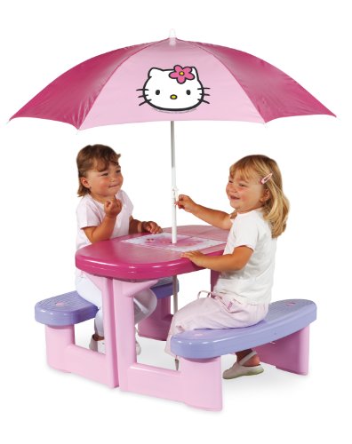 Il Tavolino Smoby Pic Nic Hello Kitty con Ombrellone composto da 2 panchine incorporate con ombrellone parasole situato al centro del tavolo. La tenera gattina Hello Kitty accompagner le bambine nei loro giochi all'aria aperta. Sicurezza e qualit garantita dal marchio Smoby. Adatto da 3m+.