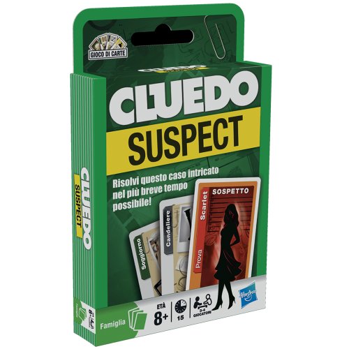 CLUEDO SUSPECT hasbro pocketgioco di carte, investigazioneindividua il colpevole di un misfattodagli 8 anni n su15 minuti: durata di una partita mediadai 3 ai 4 giocatori