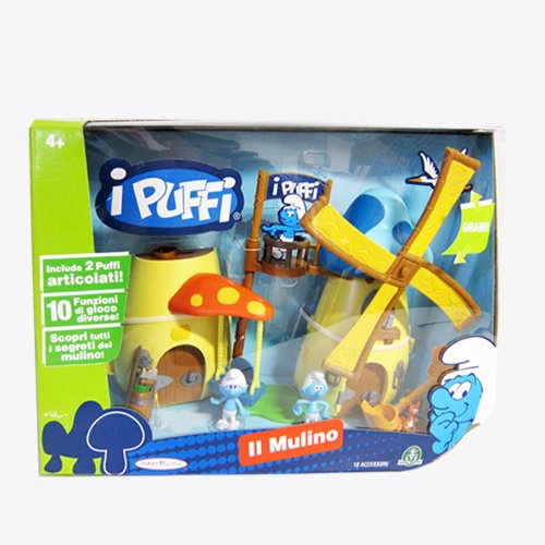 Il nuovissimo playset il mulino dei puffi include 2 puffi articolati e 10 accessori per 10 funzioni di gioco diverserichiudibile per portarlo sempre con tecontiene: forzuto, tontolone, 1 barile, 1 scala, 1 ascia, 1 libro, 1 pala, 1 bottiglia, 1 altalena e 1 mulino