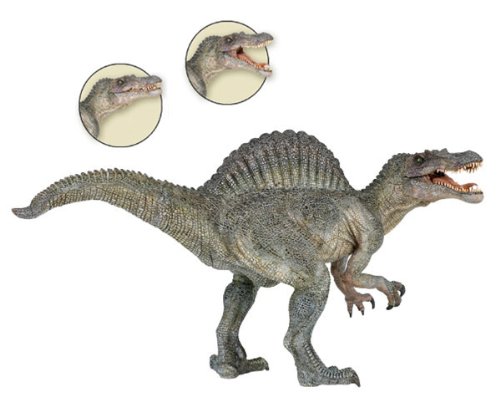 Magnifica riproduzione del TERRIFICANTE SPINOSAURUS dipinto a mano con vernici atossiche. LE SUE MANDIBOLE MOBILI DANNO ANCORA DI PIU' L'ASPETTO TEMIBILE DI QUESTA BELLISSIMA RIPRODUZIONE. Lo Spinosauro un dinosauro vissuto nel Nord dell'Africa fra i 100 e i 110 milioni di anni fa, nell'era preistorica del Cretaceo e apparteneva alla famiglia dei Teropodi, i dinosauri carnivori che stavano eretti su due zampe. Anche i denti dello Spinosauro presentano una forma pi simile a quella dei coccodrilli, sono infatti conici a differenza di quelli del tirannosauro che erano appiattiti lateralmente e seghettati. In base a questa e altre caratteristiche si suppone che l'alimentazione dello Spinosauro fosse prevalentemente a base di pesce.